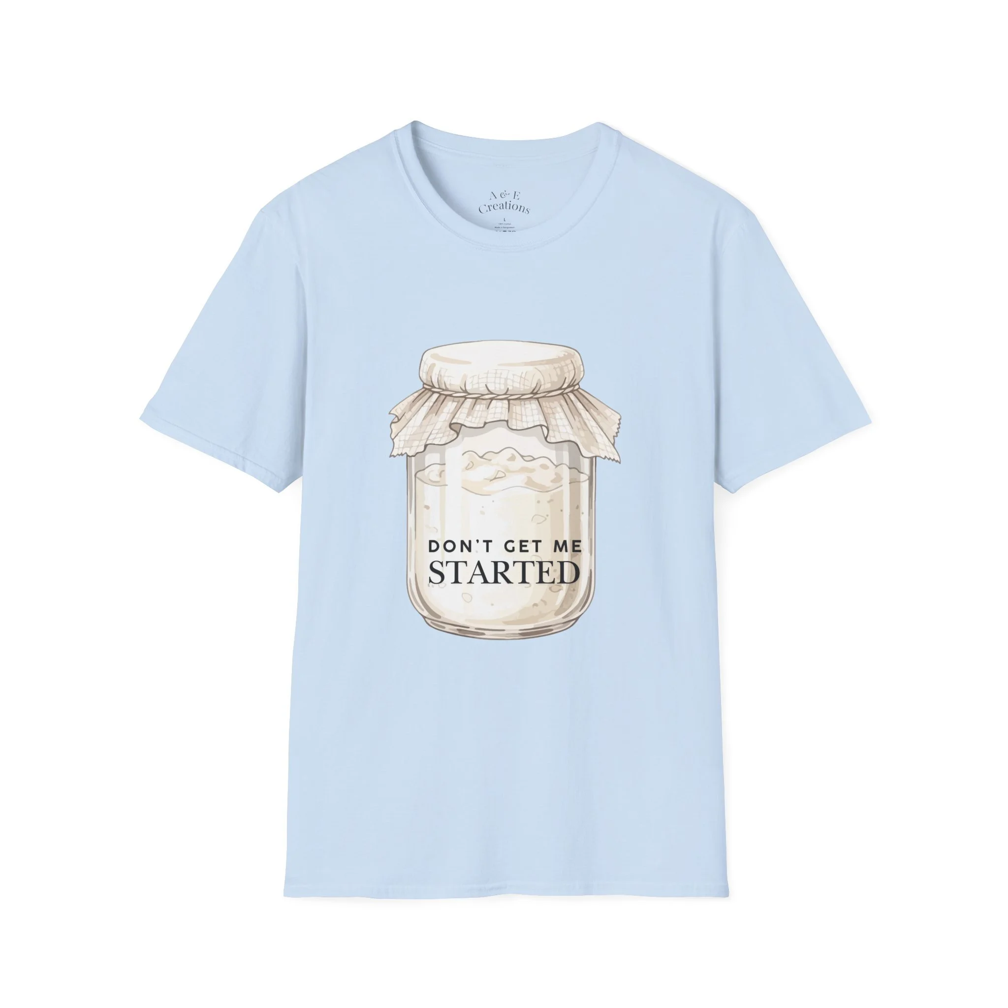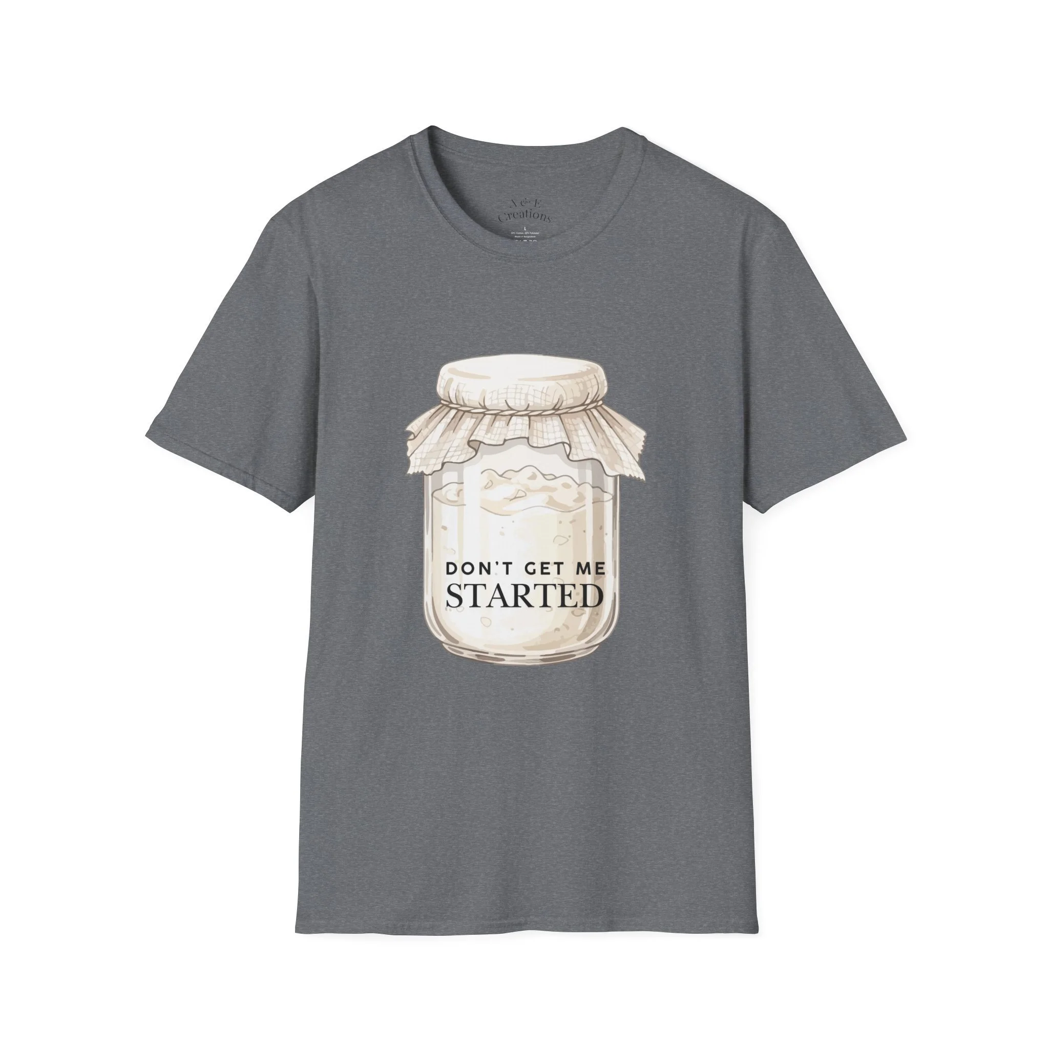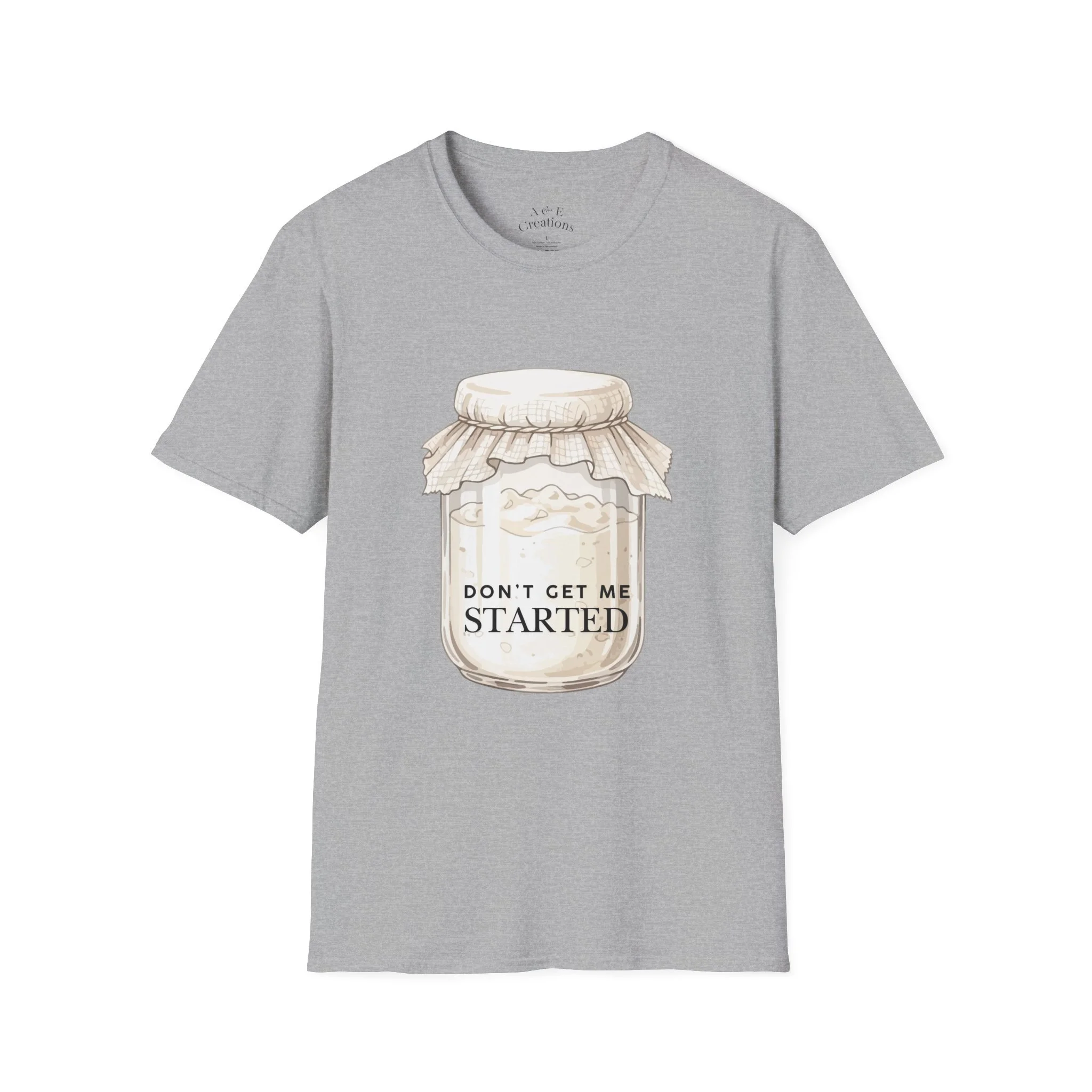 A soft, lived-in tee for bakers who speak in puns and flour-dusted hands. The simple line art of a sourdough starter jar sits center-front with the caption “dont get me started” — wry, warm, and a little bit stubborn. Wear it on slow Sunday mornings while feeding your starter, at community bake swaps, or around friends who know the difference between a levain and a lie-in. The shirt’s light, smooth fabric lets the print pop without feeling stiff; the crew neckline and classic fit layer easily under an apron or a cozy cardigan. It feels like the friend who brings starter to share: steady, humorous, and totally homey.