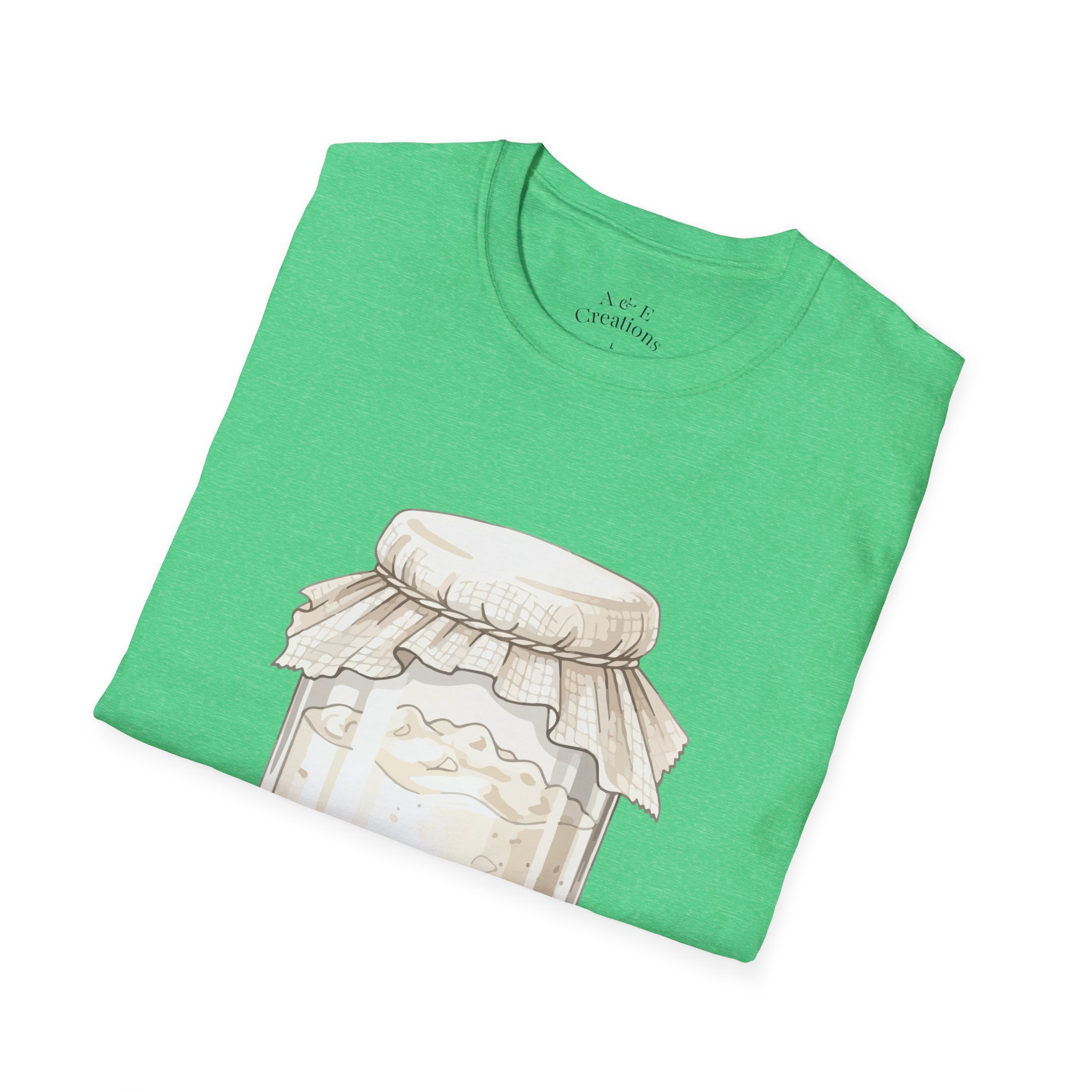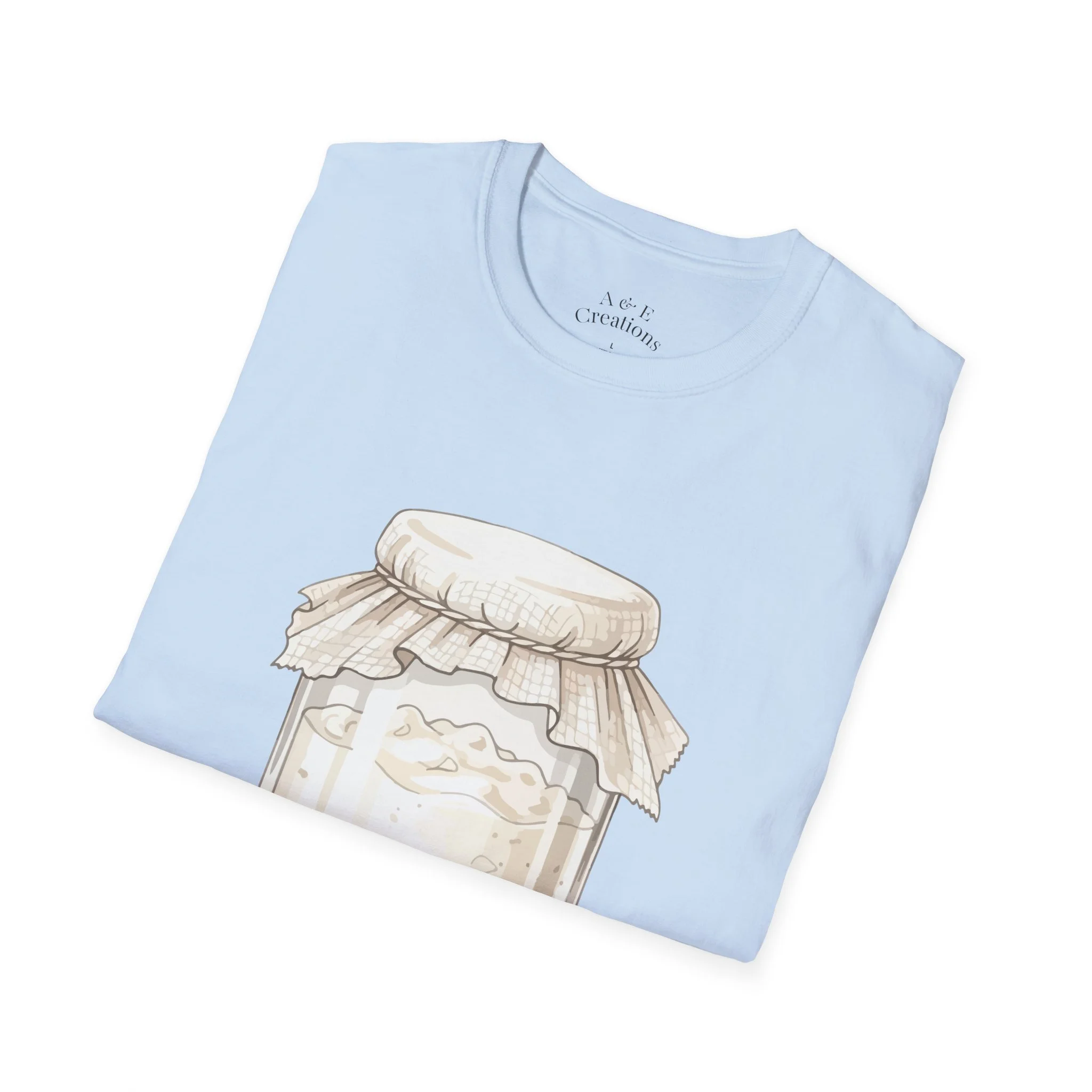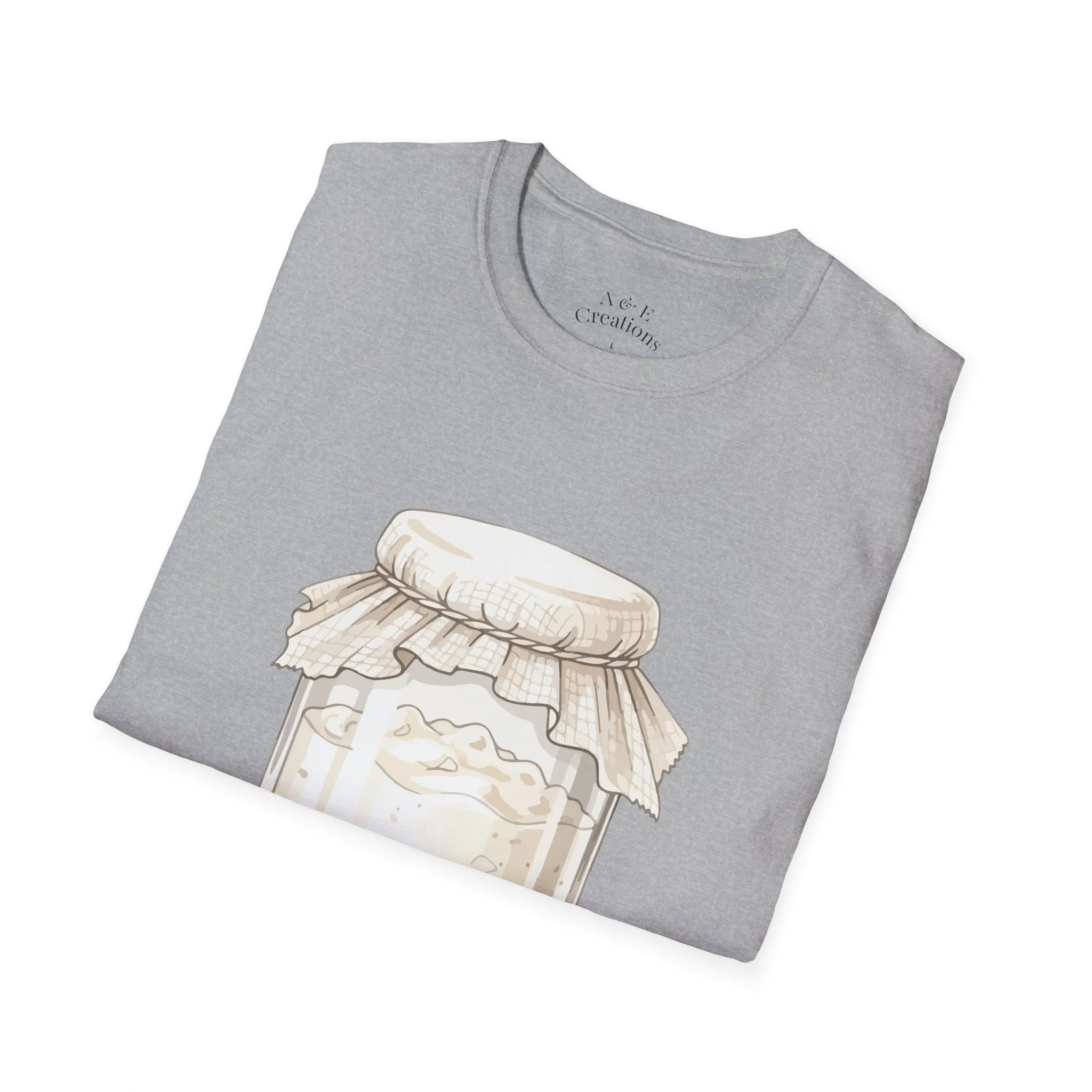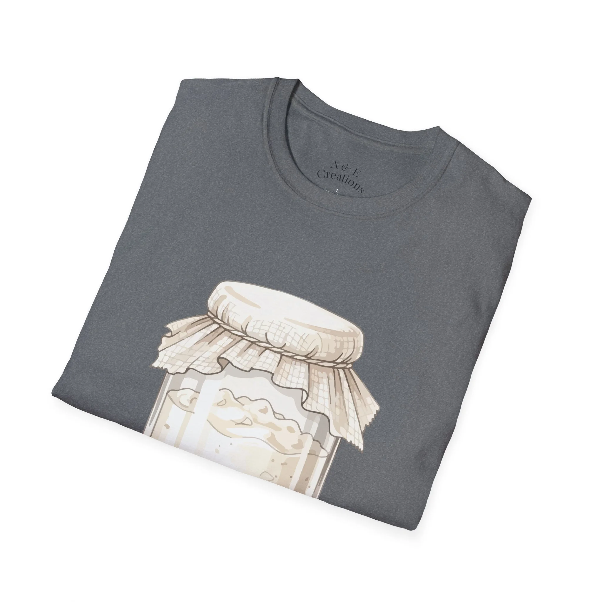A soft, lived-in tee for bakers who speak in puns and flour-dusted hands. The simple line art of a sourdough starter jar sits center-front with the caption “dont get me started” — wry, warm, and a little bit stubborn. Wear it on slow Sunday mornings while feeding your starter, at community bake swaps, or around friends who know the difference between a levain and a lie-in. The shirt’s light, smooth fabric lets the print pop without feeling stiff; the crew neckline and classic fit layer easily under an apron or a cozy cardigan. It feels like the friend who brings starter to share: steady, humorous, and totally homey.